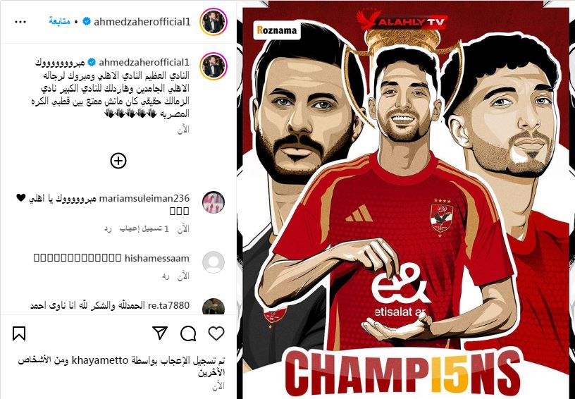 أحمد زاهر وتامر عاشور يهنئون الأهلي على التتويج بكأس السوبر المصري (صور)