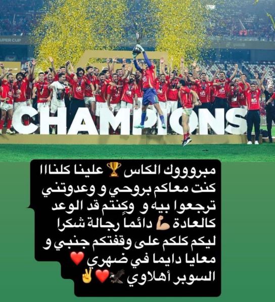 تعرف علي تعليق كهربا بعد تتويج الأهلي بالسوبر المصري (صورة)