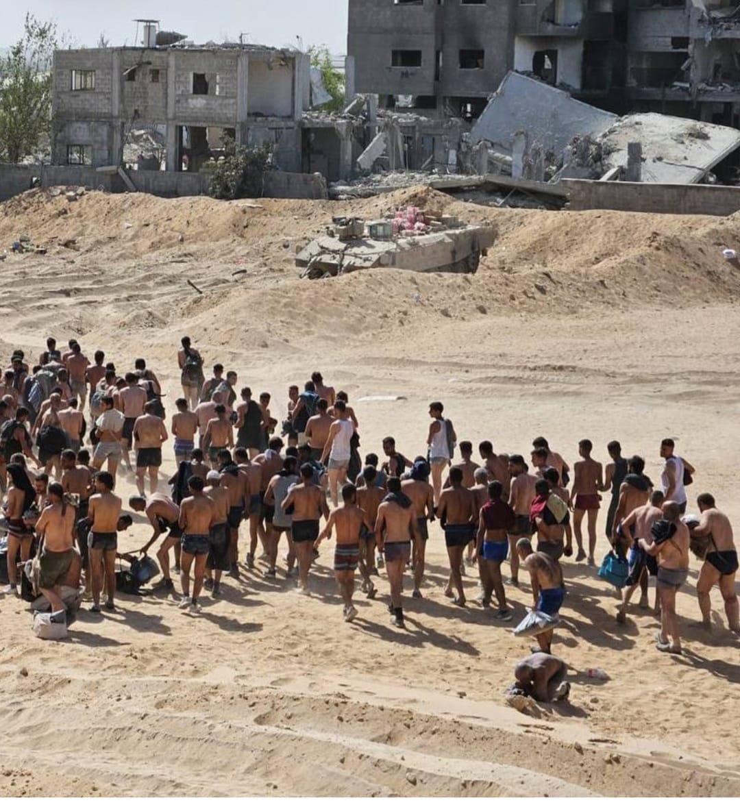 نشر الإعلام الإسرائيلي صور لعشرات الفلسطينيين لحظة احتجازهم من قبل الجيش الاسرائيلي قرب مستشفى كمال عدوان في جباليا، و أجبروهم على خلع ملابسهم.