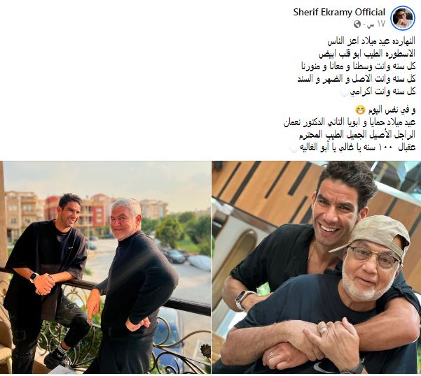 كما هنأ حماة الدكتور نعمان وعلق على صورة تجمعه به “ في نفس اليوم عيد ميلاد حمايا وابويا الثاني الراجل الأصيل الجميل الطيب المحترم عقبال 100 سنة”.