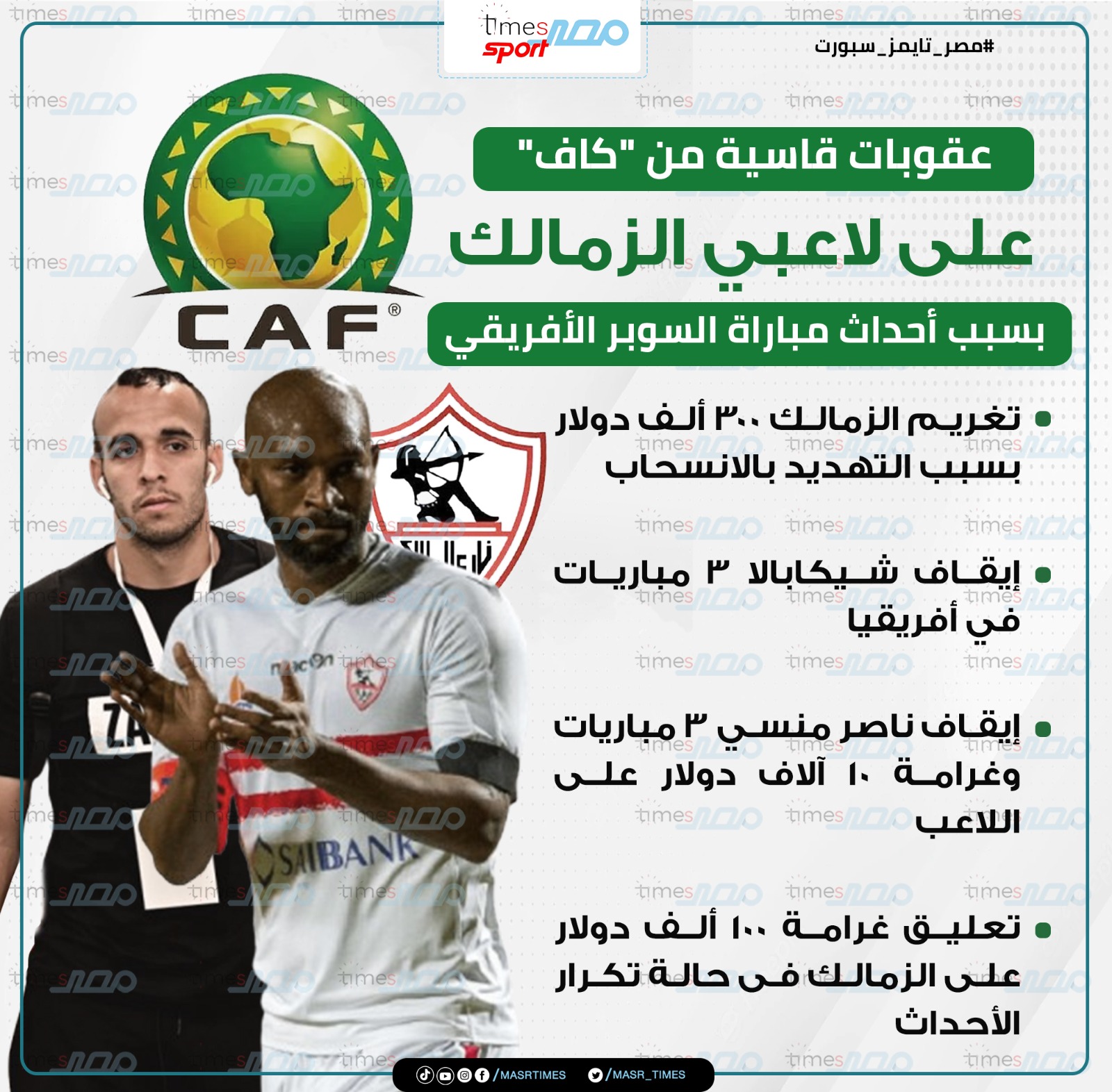 أصدر الاتحاد الإفريقي لكرة القدم "كاف" عقوبات على نادى الزمالك على خلفية أحداث مباراة السوبر الأفريقي أمام الأهلى، والتى أقيمت فى السعودية، ونجح الفارس الأبيض بالتتويج باللقب بركلات الجزاء.