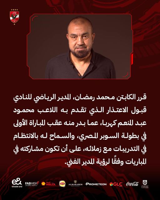 قرر الكابتن محمد رمضان، المدير الرياضي للنادي الأهلي، قبول الاعتذار الذي تقدم به اللاعب محمود عبد المنعم كهربا، عما بدر منه عقب المباراة الأولى في بطولة السوبر المصري، والسماح له بالانتظام في التدريبات مع زملائه، على أن تكون مشاركته في المباريات وفقًا لرؤية المدير الفني.