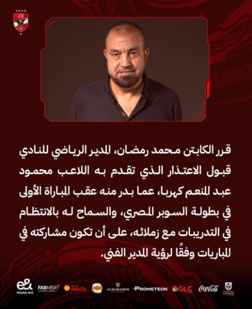 ونشر النادي الأهلي بيانًا رسميًا جاء فيه: قرر الكابتن محمد رمضان المدير الرياضي للنادي قبول الاعتذار الذي تقدم به اللاعب محمود عبد المنعم كهربا، عما بدر منه عقب المباراة الأولى في بطولة السوبر المصري، والسماح له بالانتظام في التدريبات مع زملائه، على أن تكون مشاركته في المباريات وفقا لرؤية المدير الفني.