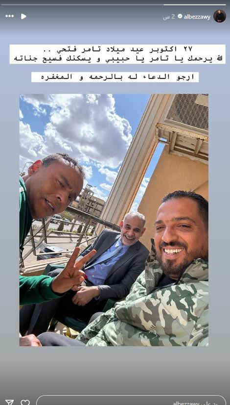 وشارك محمود البزاوي صورة تجمعه بالمنتج تامر فتحي، عبر حسابه الرسمي بموقع تداول الصور والفيديوهات “إنستجرام”، معلقا عليها قائلا: 27 أكتوبر عيد ميلاد تامر فتحي، الله يرحمك يا تامر يا حبيبي، ويسكنك فسيح جناته، ارجو الدعاء له بالرحمه والمغفرة.