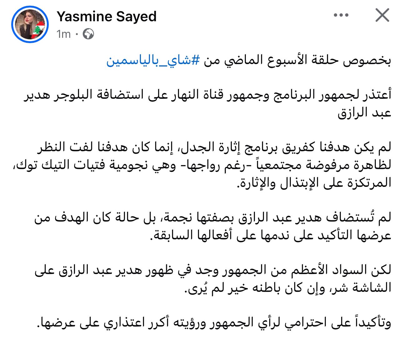 أعلنت الإعلامية ياسمين الخطيب عن اعتذارها لجمهور برنامج “شاي بالياسمين” وقناة النهار بعد استضافتها البلوجر هدير عبدالرازق في حلقة الأسبوع الماضي.