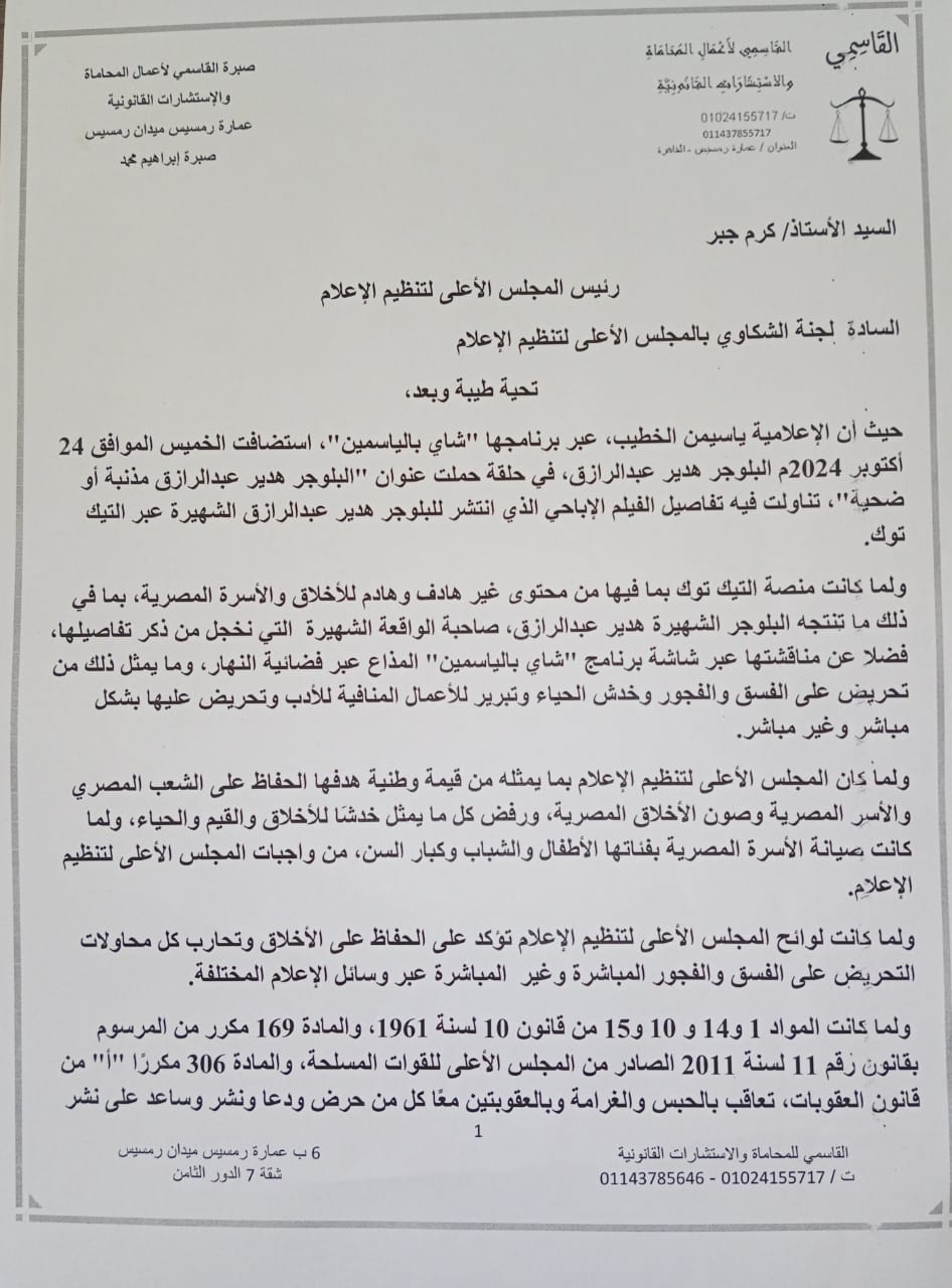 وطالب "القاسمي" بالتحقيق مع ياسمين الخطيب وقناة النهار وفقًا للمواد 1 و14 و 10 و15 من قانون 10 لسنة 1961، والمادة 169 مكرر من المرسوم بقانون رقم 11 لسنة 2011 الصادر من المجلس الأعلى للقوات المسلحة، والمادة 306 مكررًا "أ" من قانون العقوبات، التي تعاقب بالحبس والغرامة وبالعقوبتين معًا كل من حرض ودعا ونشر وساعد على نشر الفسق والفجور وخدش الحياء ومخالفة الأخلاق، سواء بشكل مباشر أو غير مباشر أو عبر أي وسيلة نشر ورقية أو إليكترونية أو فضائية.