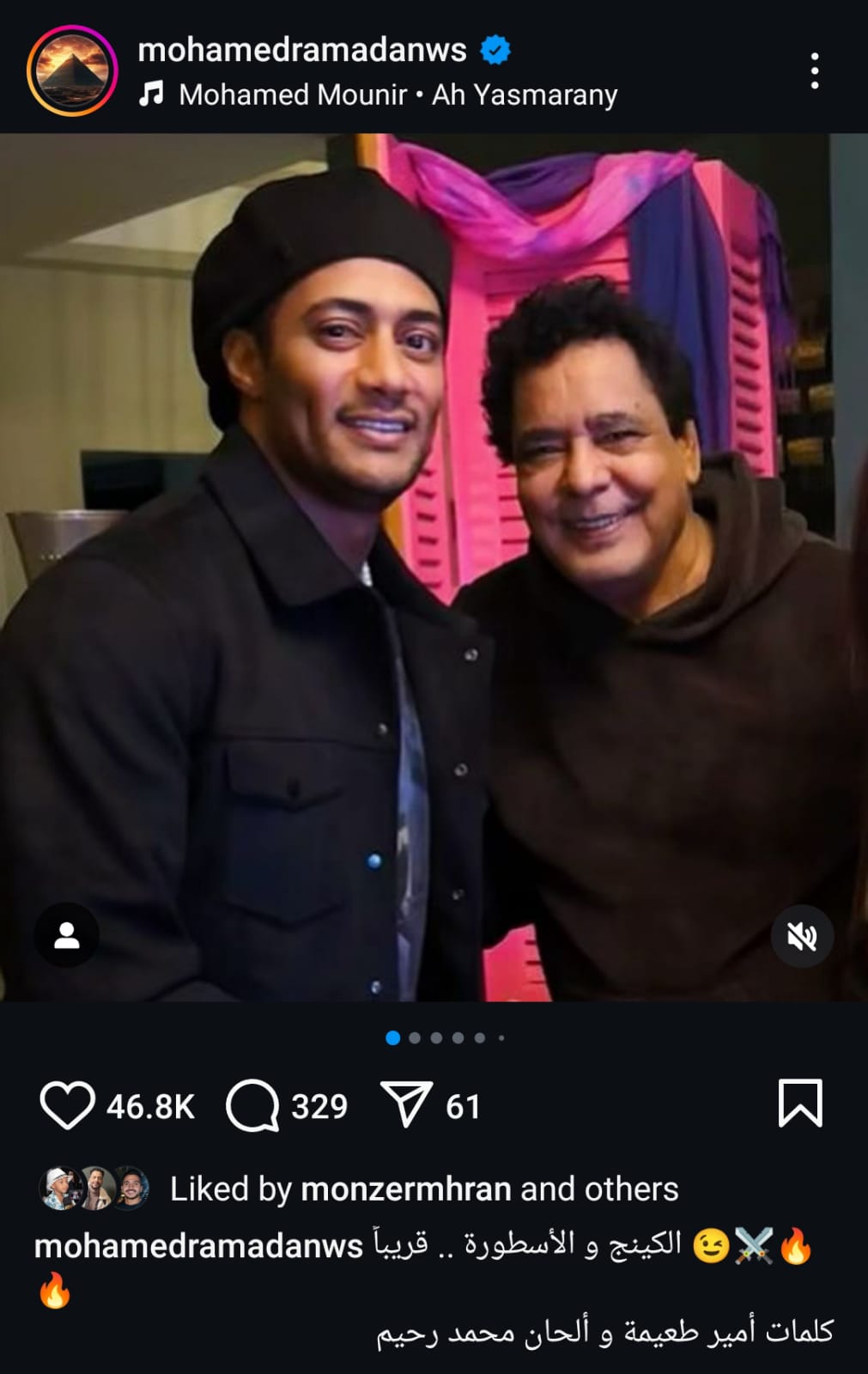 نشر محمد رمضان صورة تجمعه مع منير على صفحته الرسمية عبر موقع تبادل الصور والفيديوهات "إنستجرام" وعلق قائلا : "الكينج والأسطورة.. قريبا، كلمات أمير طعيمة وألحان محمد رحيم" .