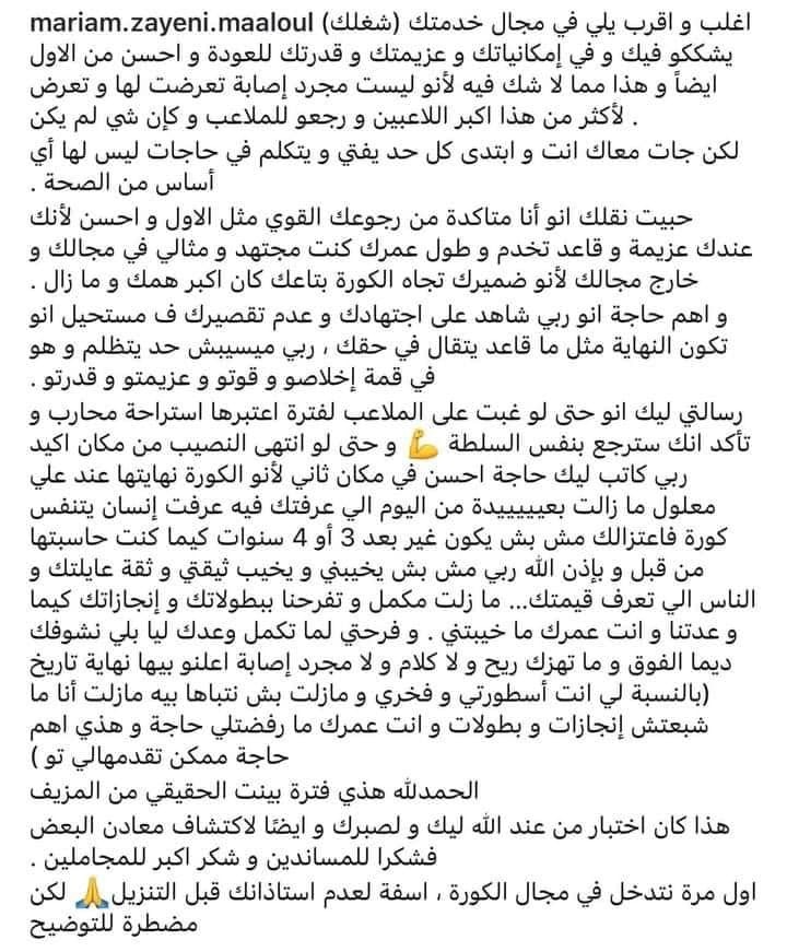 وتكمل: حبيت نقلك إن أنا متاكدة من رجوعك القوي مثل الأول وأحسن لأنك عندك عزيمة وقاعد تخدم وطول عمرك كنت مجتهد ومثالي في مجالك وخارج مجالك لأن ضميرك تجاه الكورة بتاعك كان أكبر همك و ما زال.