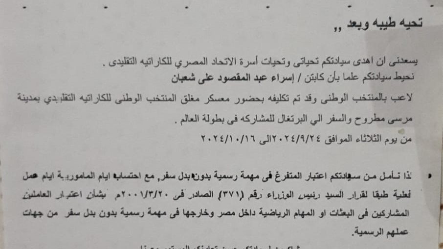 وفي هذا الصدد، حصل موقع "مصر تايمز" على صورة المستند الذي تم إرساله من وزارة الشباب والرياضة لمدير مدرسة التجارة بنات بمركز بركة السبع بمحافظة المنوفية؛ قبل سفر الطالبة إسراء عبدالمقصود بطلة العالم في الكاراتيه مع بعثة الاتحاد لدولة البرتغال.