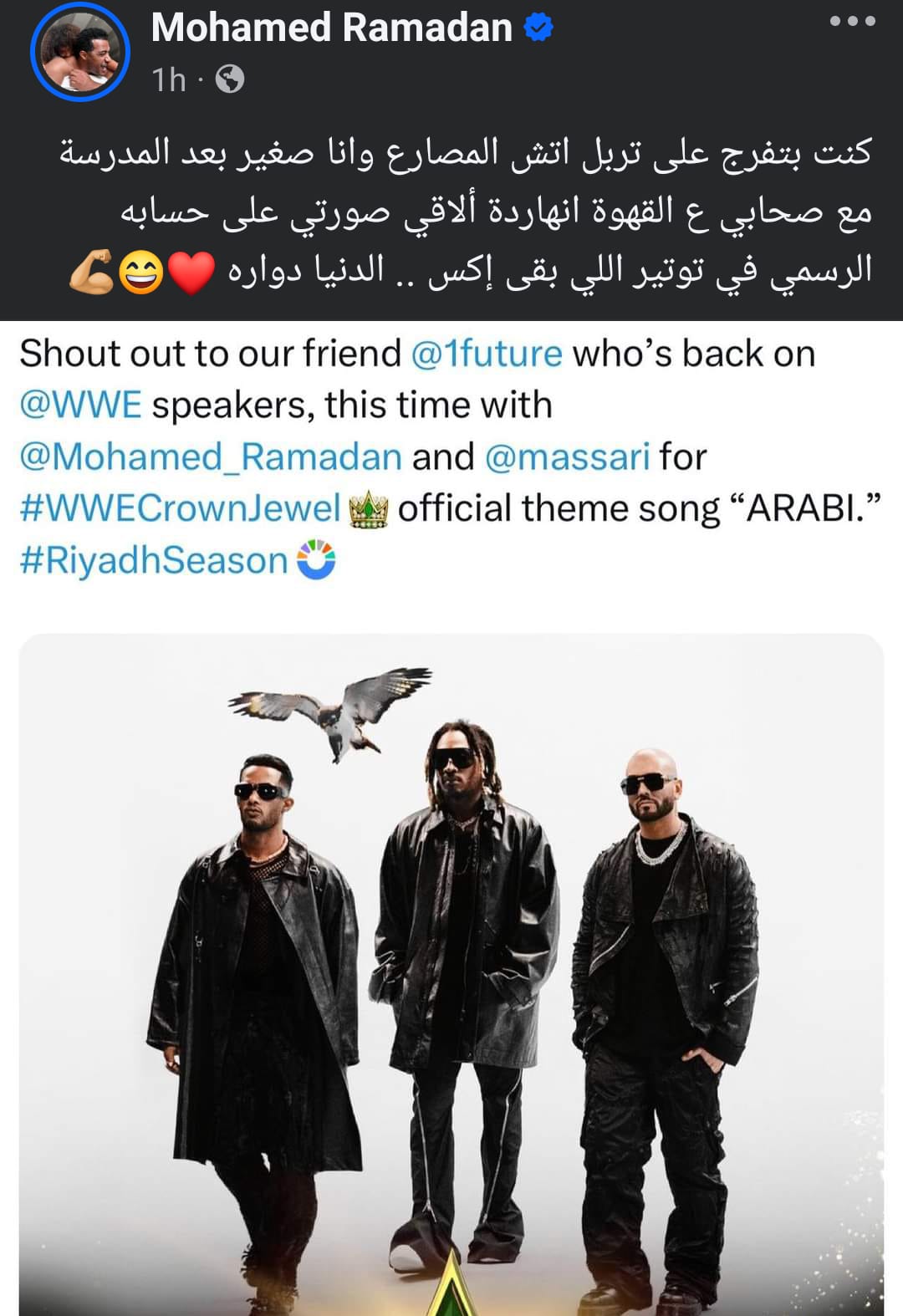قرر الفنان محمد رمضان توجيه رسالة للمصارع وبطل العالم السابق تريبل اتش وذلك بعد أن أعلن الأخير عن استعمال أغنيته الشهيرة عربي الأغنية الرسمية للعرض الشهير Crown Jewel الذي من المقرر أن ينطلق خلال الأيام المقبلة بالمملكة العربية السعودية.