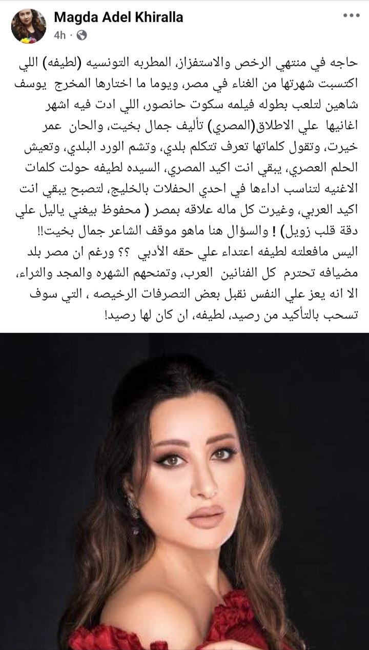 وكتبت خيرالله عبر صفحتها الرسمية "فيس بوك" حاجة في منتهى الرخص والاستفزاز، المطربة التونسية لطيفة التي اكتسبت شهرتها من الغناء في مصر، ويوما ما اختارها المخرج يوسف شاهين لتلعب بطولة فيلمه سكوت حانصور، الذي أدت فيه أشهر أغانيها على الإطلاق "المصري" تأليف جمال بخيت، وألحان عمر خيرت، وتقول كلماتها تعرف تتكلم بلدي، وتشم الورد البلدي، وتعيش الحلم العصري، يبقي انت اكيد المصري، السيده لطيفة حولت كلمات الأغنية لتناسب أداءها، في إحدى الحفلات بالخليج، لتصبح يبقي انت اكيد العربي، وغيرت كل ماله علاقة بمصر محفوظ بيغني ياليل على دقة قلب زويل.