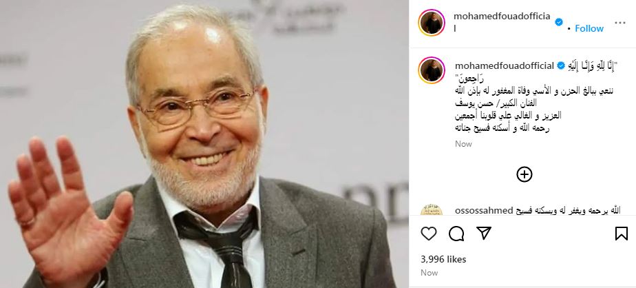 وشارك محمد فؤاد صورة النجم الراحل حسن يوسف وعلق "إِنَّا لِلّهِ وَإِنَّـا إِلَيْهِ رَاجِعونَ"