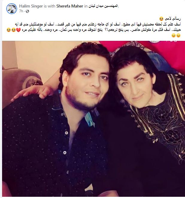 وشارك حليم نجل الراحلة صورة تجمعه بها وعلق عليها" رسالة لامي..، اسف على كل لحظه محستيش فيها اني مطيع.. اسف لو اي حاجه زعلتي مني فيها من غير قصد... اسف لو موصلكش مني قد ايه حبيتك.. اسف فكل مرة مقولتش حاضر.. بس ينفع ترجعي!؟ ينفع اشوفك مره واحده بس كمان.. مره وحده.. بالله عليكي مره".