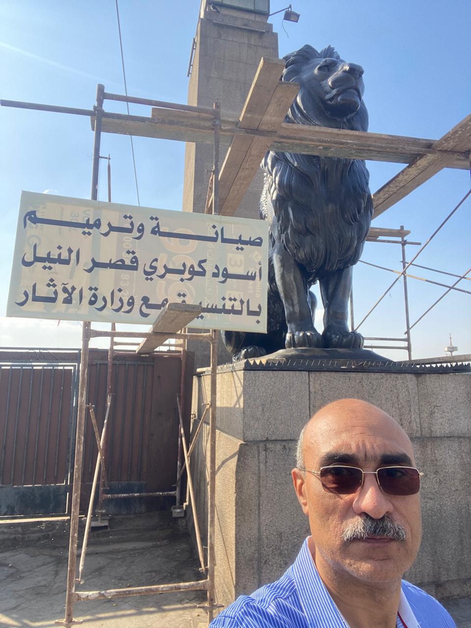 قال منصور انه توجه اليوم لموقع الأعمال بكوبري قصر النيل ، حيث وجد أعمال صيانة من ضمن خطة لصيانة ٢١ تمثال بالميادين العامة بالقاهرة أعلنت عنها محافظة القاهرة ووزارة السياحة و الآثار ، و تزامن ذلك مع إعلان نقابة الفنانين التشكيليين عن تخوفها من أعمال صيانة أسود قصر النيل ، ثم عادت منذ ساعات قليلة لتشكر المسؤولين على دعوتهم لعقد اجتماع اليوم للتشاور فى الامر !.