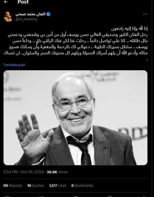وكتب محمد صبحي، عبر حسابه على إكس، معربا عن حزنه لوفاة حسن يوسف، قائلا:
