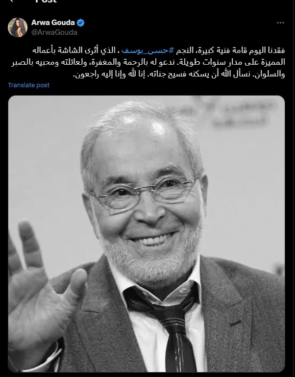 نعت الفنانة أروى جودة، وفاة الفنان حسن يوسف عبر حسابها الرسمي بموقع تبادل التغريدات إكس خلال الساعات القليلة الماضية، وذلك بعد رحيله عن عالمنا اليوم الثلاثا عن عمر يناهز ال 90 عام.
