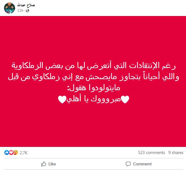 وكتب صلاح عبدالله عبر صفحته الرسمية" فيس بوك " رغم الإنتقادات التي أتعرض لها من بعض الزملكاوية واللي أحياناً بتجاوز مايصحش مع إني زملكاوي من قبل مايتولودوا هقول ، مبروك يا أهلي".