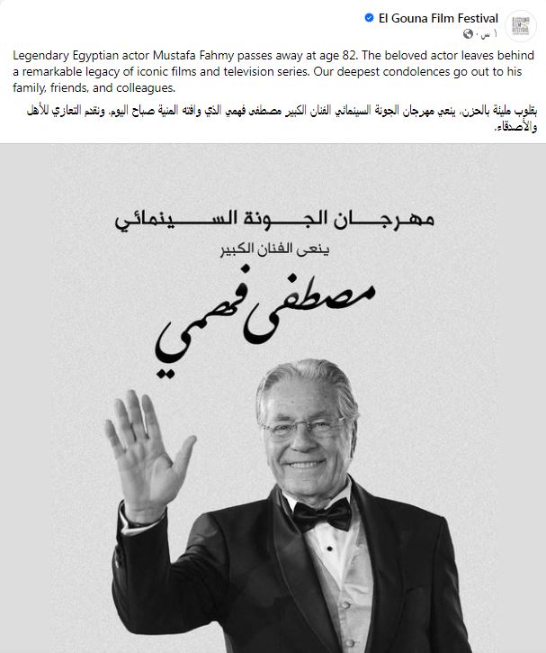 نعت الصفحة الرسمية لمهرجان الجونة السينمائي الفنان مصطفي فهمي الذي رحل عن عالمنا صباح اليوم، تاركا وراءه إرثاً فنياً من الأعمال السينمائية والتليفزيونية.