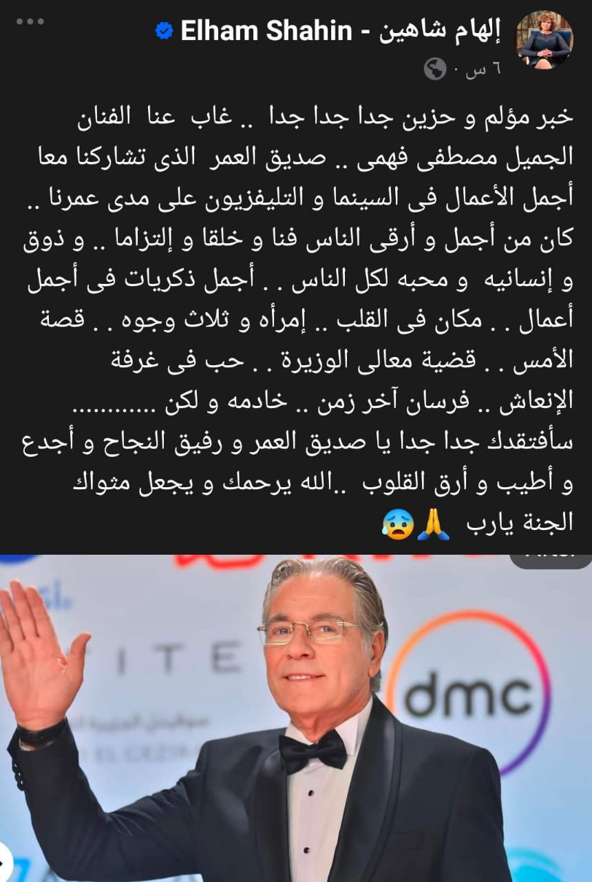 وكتبت إلهام شاهين، عبر حسابها على فيسبوك، ناعية مصطفى فهمي، قائلة: خبر مؤلم و حزين جدا جدا جدا، غاب عنا الفنان الجميل مصطفى فهمى، صديق العمر الذى تشاركنا معا أجمل الأعمال فى السينما و التليفزيون على مدى عمرنا.