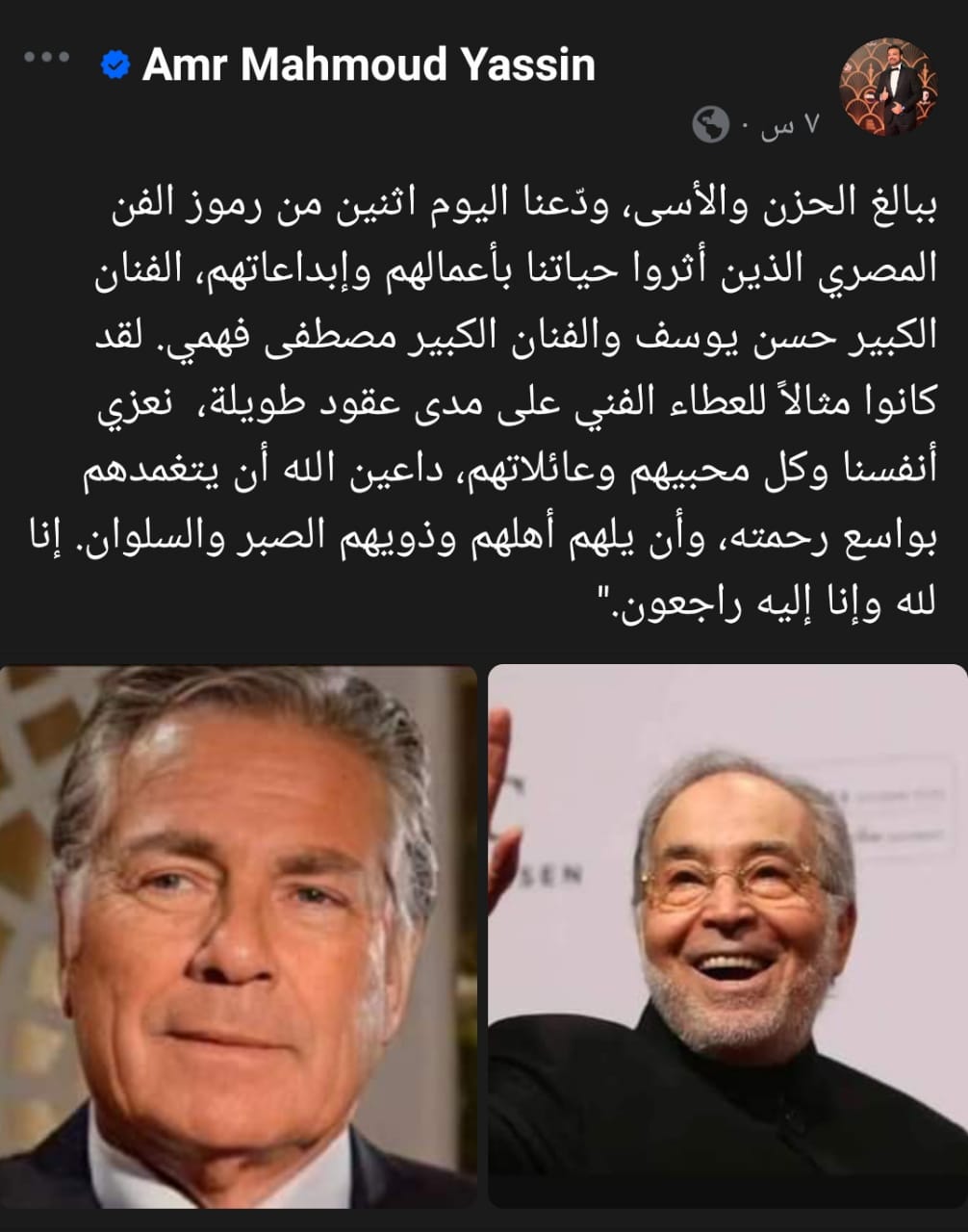 وكتب عمرو محمود ياسين عبر حسابه على فيسبوك، معربا عن حزنه لوفاة النجمين حسن يوسف ومصطفى فهمي، قائلا: ببالغ الحزن والأسى، ودّعنا اليوم اثنين من رموز الفن المصري الذين أثروا حياتنا بأعمالهم وإبداعاتهم، الفنان الكبير حسن يوسف والفنان الكبير مصطفى فهمي.