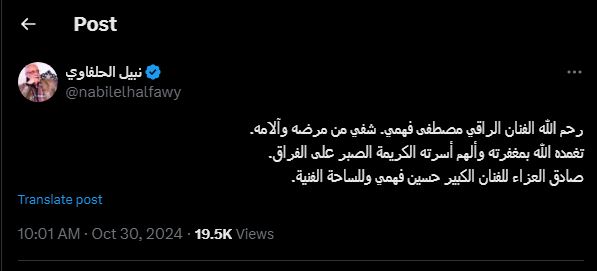وكتب نبيل الحلفاوي عبر حسابه على «إكس» تويتر سابقآ : «رحم الله الفنان الراقي مصطفى فهمي، شفي من مرضه وآلامه، تغمده الله ومغفرته وألهم أسرته الكريمة الصبر على الفراق، صادق العزاء للفنان الكبير حسين فهمي و للساحة الفنية».