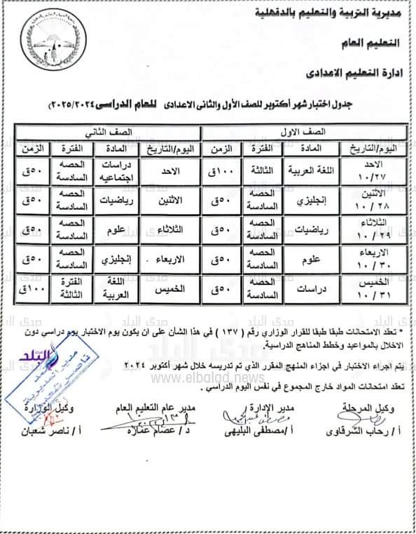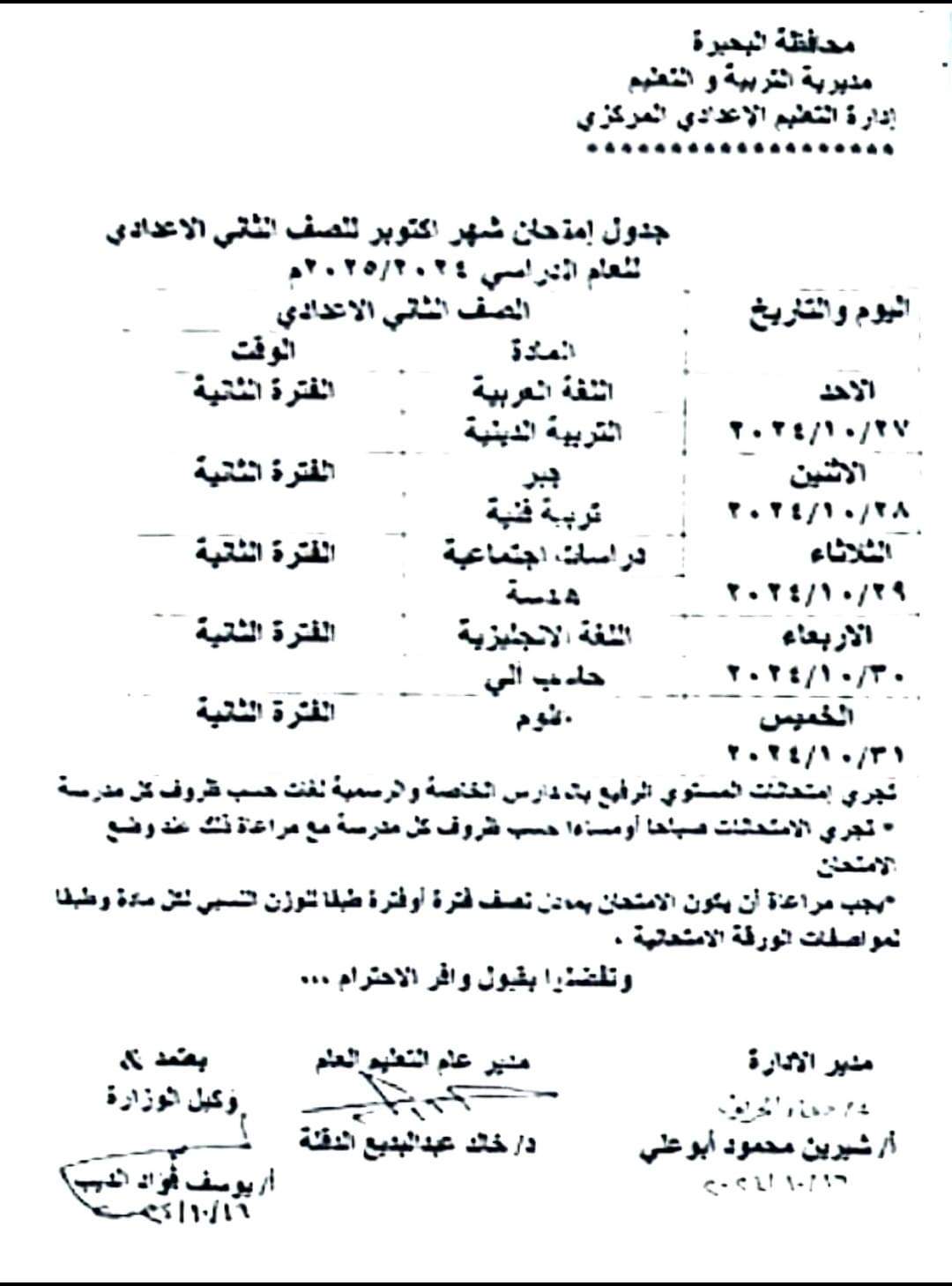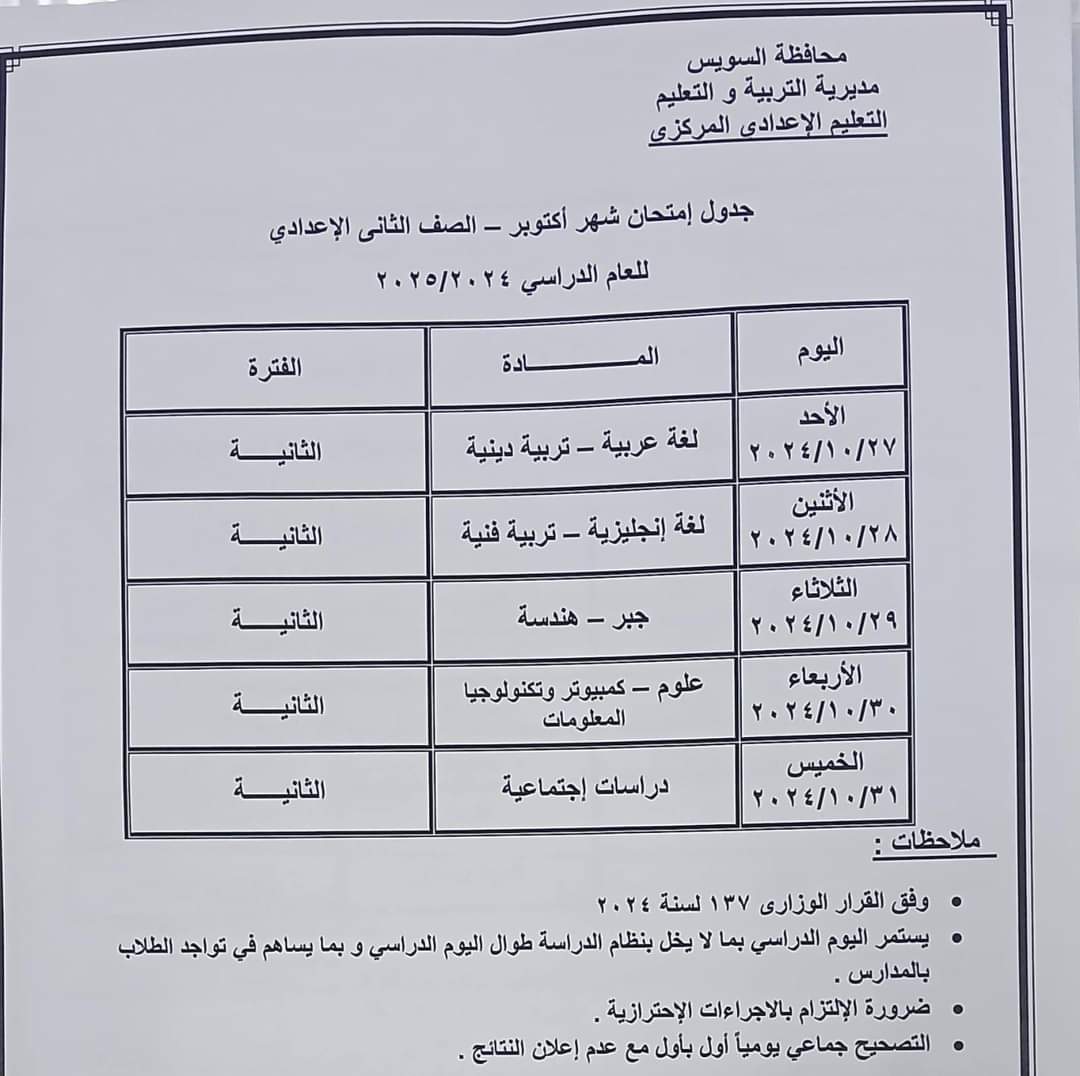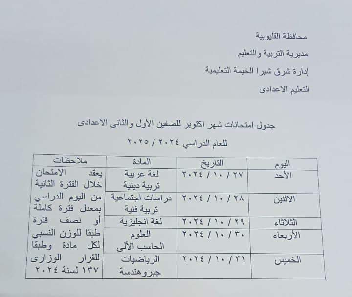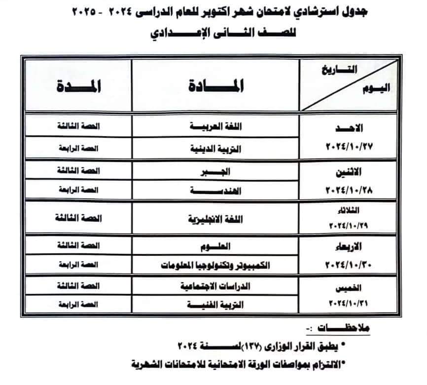 وجاءت مقررات امتحانات شهر أكتوبر للصف الثاني الإعدادي في جميع المواد كالتالي: