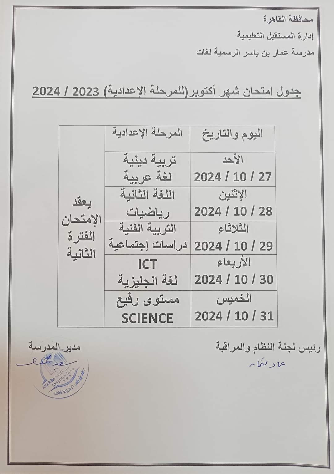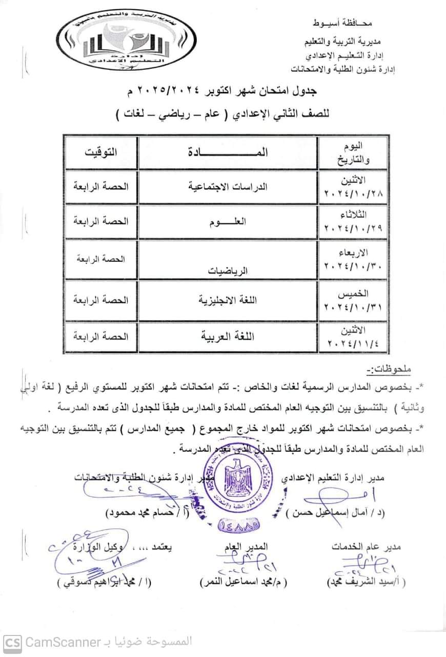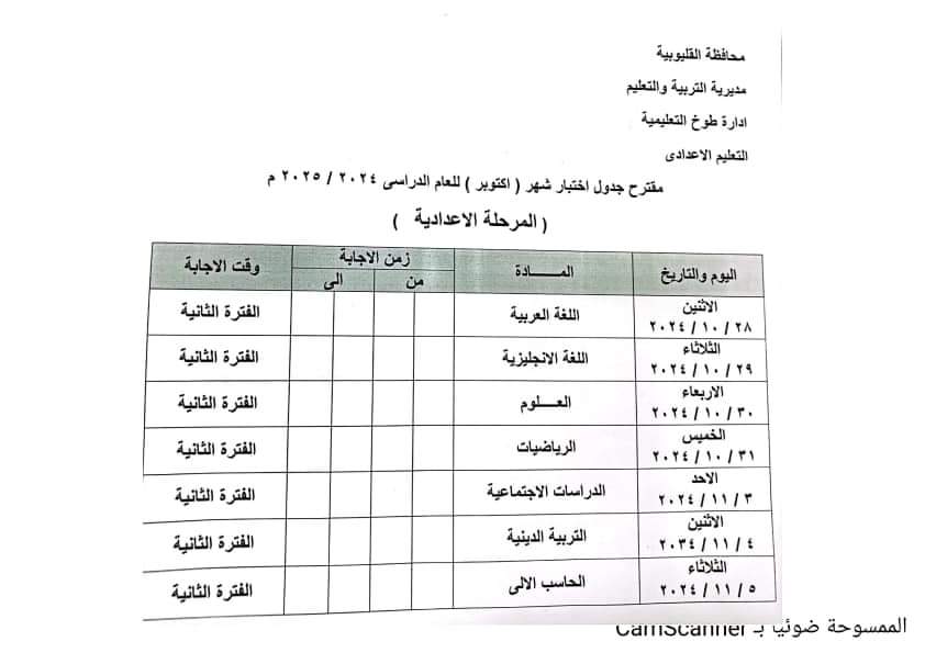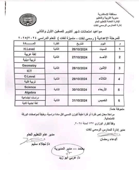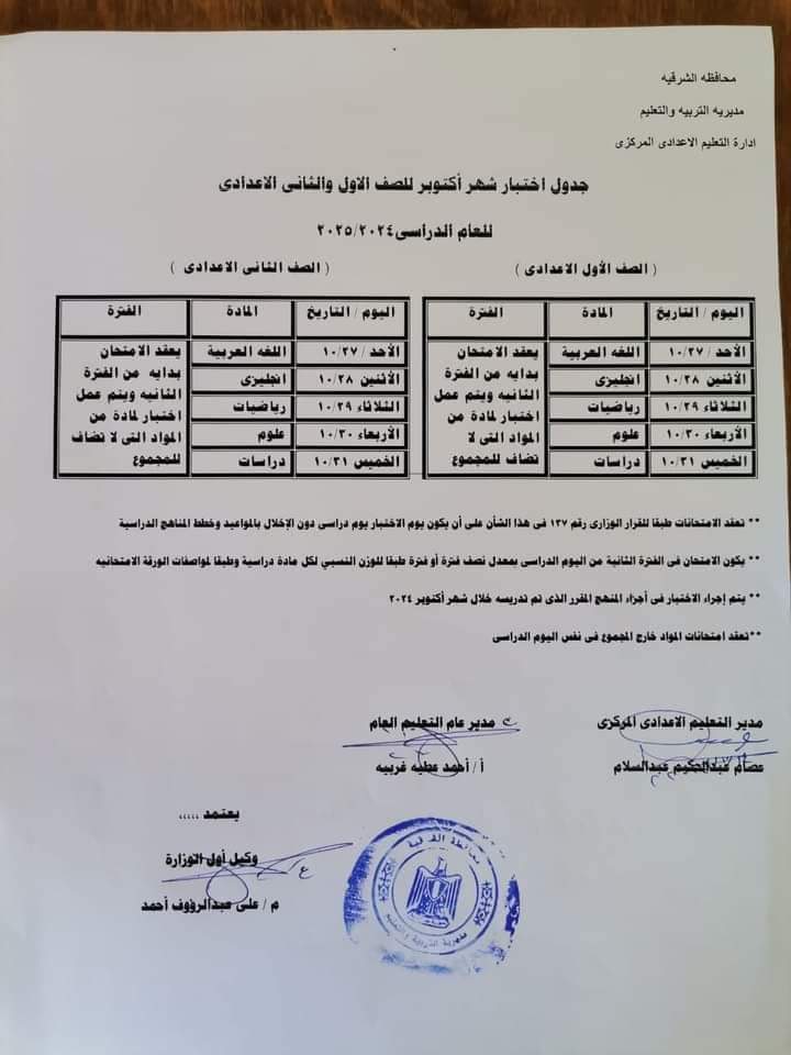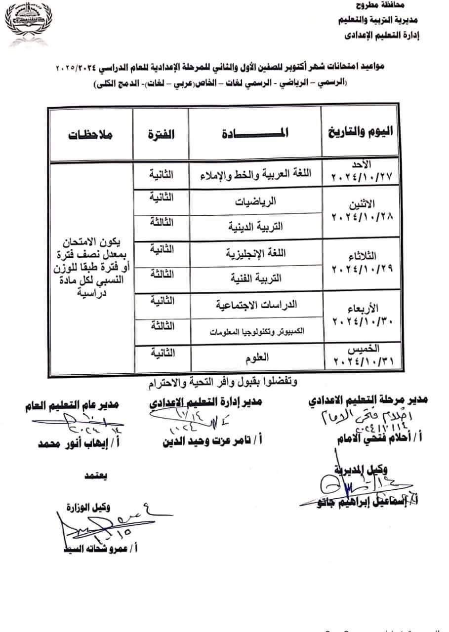 وجاءت مقررات امتحانات شهر أكتوبر للصف الثاني الإعدادي في جميع المواد كالتالي: