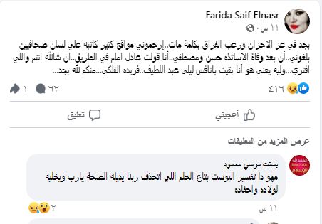 ونفت الفنانة فريدة سيف النصر هذا الكلام عبر صفحتها الرسمية "فيس بوك" وعلقت بجد في عز الاحزان ورعب الفراق بكلمة مات..ارحموني مواقع كتير كاتبه علي لسان صحافيين بلغوني..أن بعد وفاة الاساتذه حسن ومصطفي..أنا قولت عادل امام في الطريق..ان شالله انتم واللي افتري...وليه يعني هو أنا بقيت بانافس ليلي عبد اللطيف..فريدة الفلكي...منكم لله بجد ".
