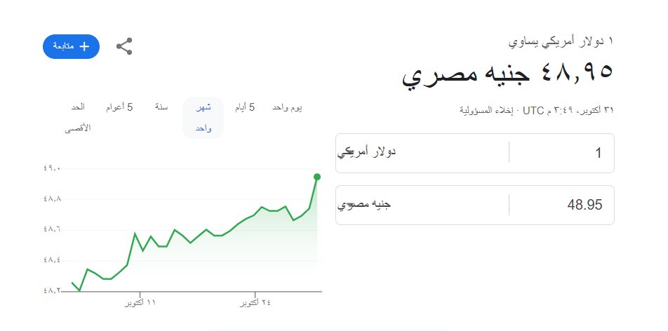 وسجل سعر الدولار مقابل الجنيه المصري اليوم على مؤشر جوجل 48.95 جنيه.