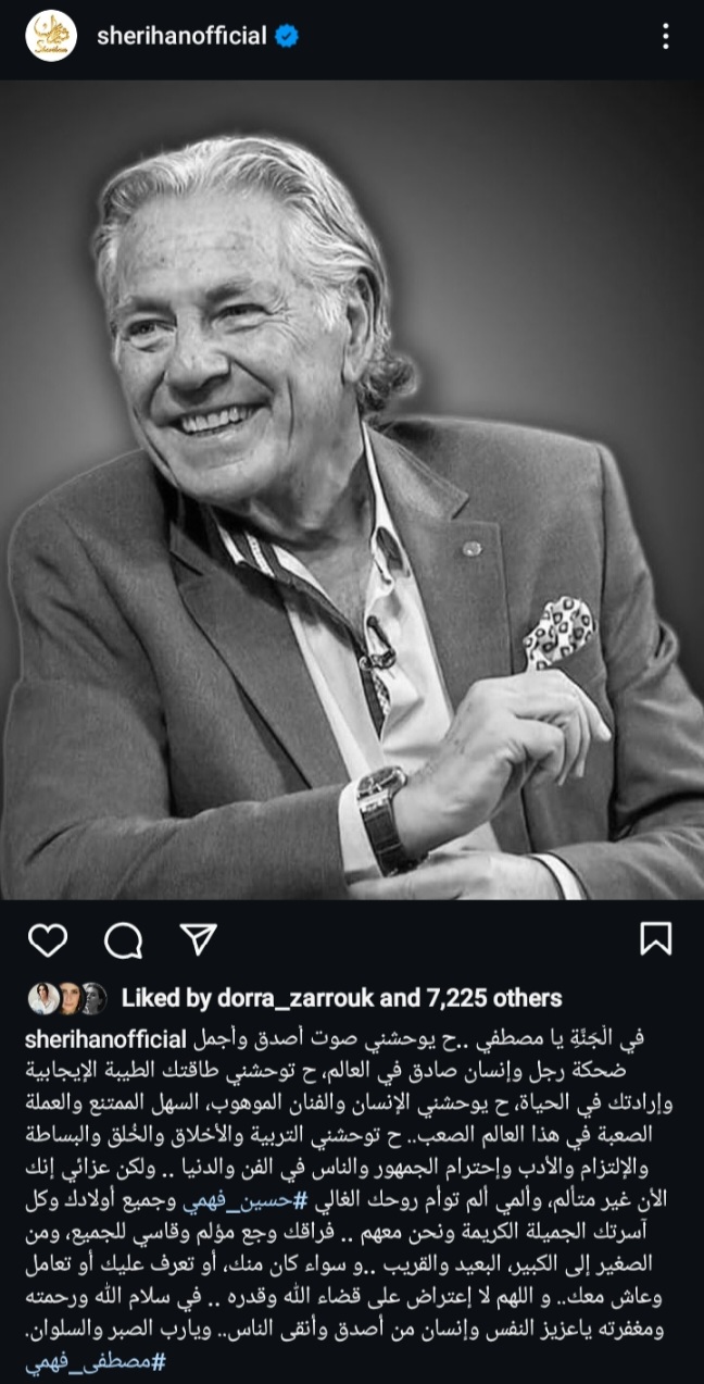 وشاركت صورة للنجم الراحل عبر صفحتها الرسمية " إنستجرام" وعلقت "في الْجَنَّةِ يا مصطفى ..هيوحشني صوت أصدق وأجمل ضحكة رجل وإنسان صادق في العالم، هتوحشني طاقتك الطيبة الإيجابية وإرادتك في الحياة".