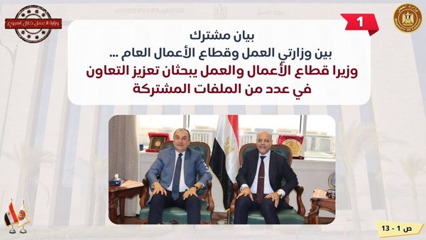 ناقش الجانبان طُرق تكثيف الجهود للإستمرار في المُشاركة في تنفيذ أهداف المبادرة الرئاسية "بداية جديدة لبناء الإنسان" ،خاصة في مجالات "التدريب من أجل التشغيل"،والاستفادة من إمكانيات الوزارة في هذا الشأن ..والتقى الوزير مع المهندس شريف الشربيني، وزير الإسكان والمرافق والمجتمعات العمرانية، لاستعراض سبل تعزيز التعاون المشترك بين الوزارتين، وبحث شئون العمالة بشركات مياه الشرب والصرف الصحى على مستوى الجمهورية، وجميع العاملين بقطاع التشييد والبناء.