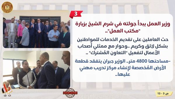 ومع نهاية الأسبوع بدأ وزير العمل السيد محمد جبران جولته، إلى مدينة شرم الشيخ ،بزيارة "مكتب العمل"،وذلك بحضور اللواء خالد متولي نائبًا عن محافظ جنوب سيناء ،اللواء د. خالد مبارك،واللواء رماح السيد هاشم رئيس مجلس المدينة، ووفاء نجاح مدير مديرية العمل بالمحافظة..تفقد الوزير "مكتب العمل" ،وإستمع إلى العاملين ،وحثهم على المزيد من العمل ،وتقديم الخدمات ،والتعامل مع المواطنين بشكل لائق وكريم.