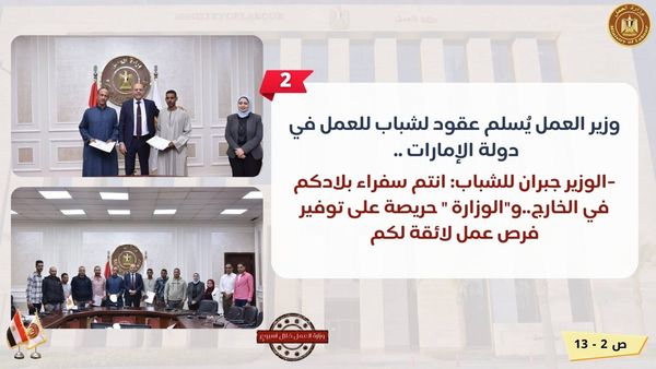 وخلال جولة الوزير داخل "المنتجع" قام الوزير بتسليم عقود عمل منها لذوي الهمم ،وتفقد سير العمل بالمنتجع . وتواصل مديريات العمل في المحافظات تنفيذ توجيهات الوزير جبران، بالاستمرار في تنفيذ أهداف المبادرة الرئاسية "بداية جديدة لبناء الإنسان" وذلك من خلال نشر ثقافة السلامة والصحة المهنية في مواقع العمل والإنتاج ،وكذلك تكثيف الجهود في مراكز التدريب المهني لتنمية مهارات الشباب على مهن المستقبل ،في اطار خطة الوزارة "التدريب من أجل التشغيل"..وتقديم الخدمات للمواطنين بشكل لائق وكريم ..إلى "الانفوجراف"..