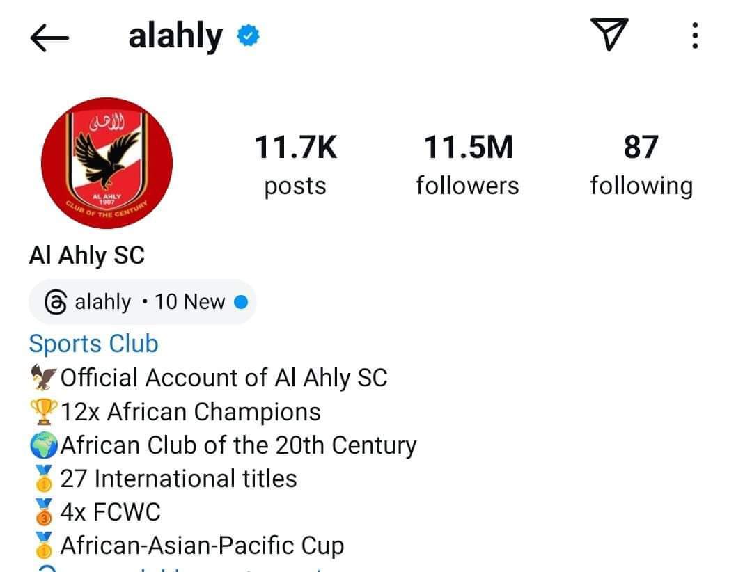 أضاف النادي الأهلي بطولة كأس القارات الثلاث علي قناة النادي و على حساب إنستجرام وجميع منصاته الرسيمة ، وذلك بعد تتويجه بها على حساب العين الإماراتي .
