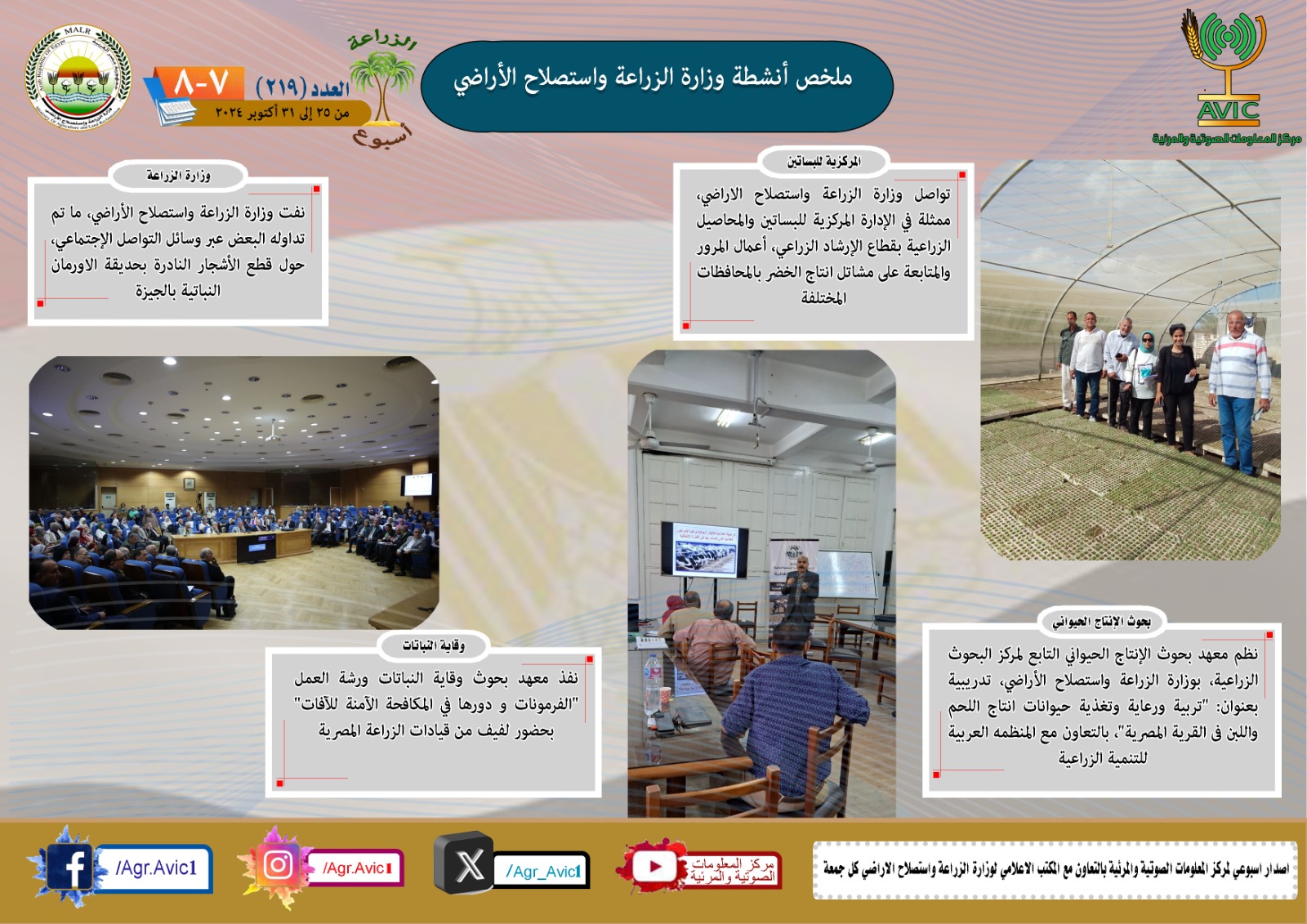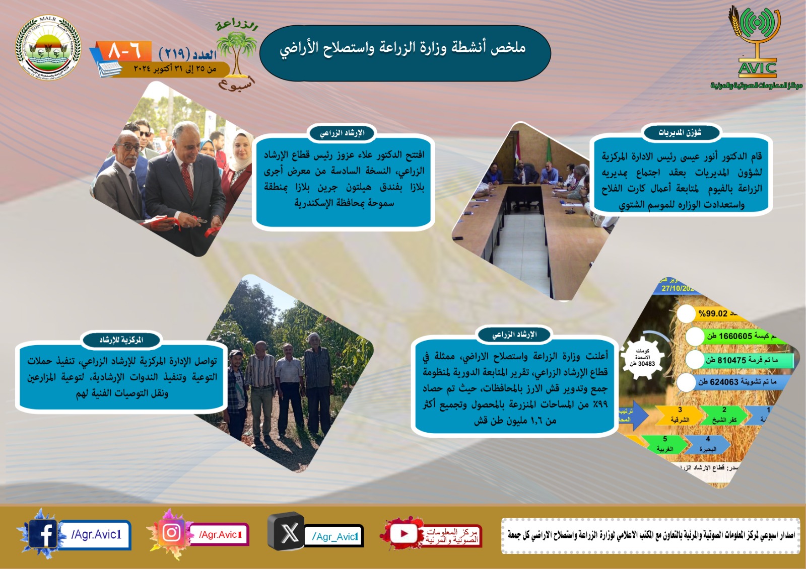 أصدر مركز المعلومات الصوتية والمرئية، التابع لوزارة الزراعة واستصلاح الاراضي، "الانفوجراف الاسبوعي" في نسخته رقم ٢١٩ حول الحصاد الاسبوعي لأهم أنشطة الوزارة، خلال الاسبوع الماضي في الفترة من ٢٥ وحتى ٣١ اكتوبر الجاري، وذلك بالتعاون مع المكتب الاعلامي للوزارة، كما أصدر المركز ايضا ملخصا بالفيديو، حول انشطة الوزارة خلال نفس الفترة.