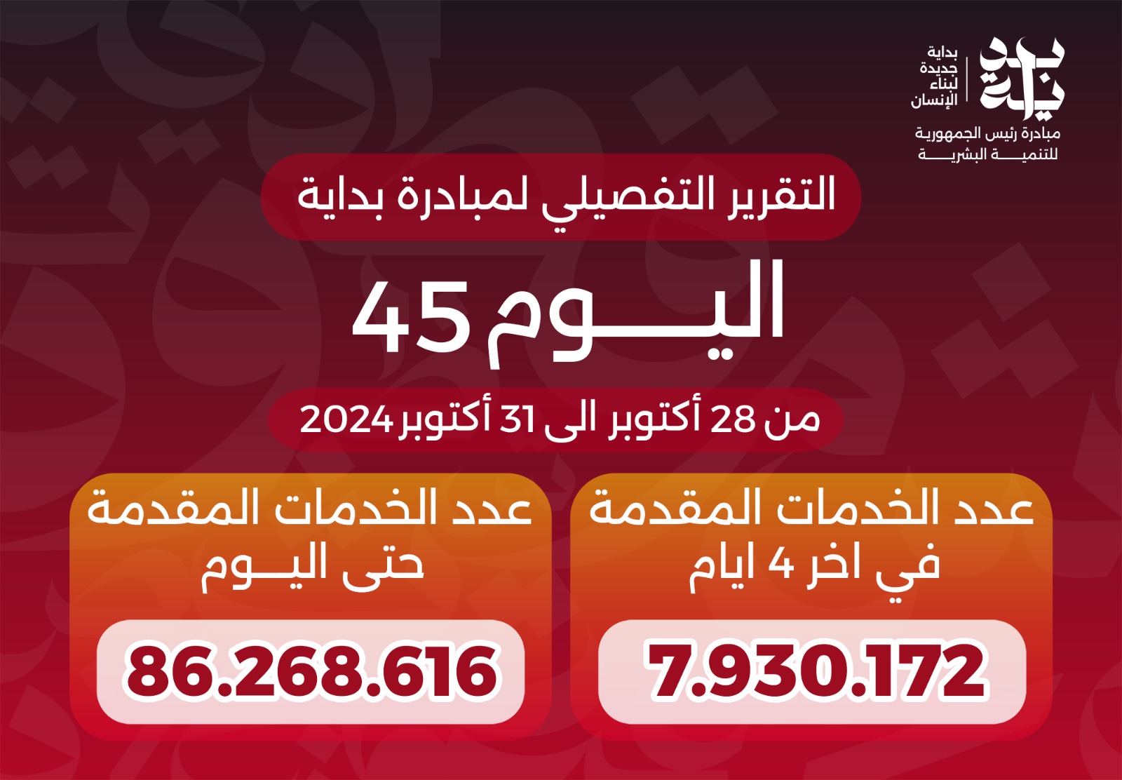 وخلال الأيام الأربع الماضية، قدمت المبادرة 7 ملايين و930 ألفا و172 خدمة، حيث استفاد من خدمات المبادرة في مجال تمكين وتدريب المرأة 32 ألفا و954 مستفيدة، وذلك عبر 161 خدمة ونشاط، كما تم توزيع 10.5 طن لحوم، وصلت لـ 10 آلاف و250 أسرة، علاوة على 52 قافلة تنموية شاملة، استفاد منها 33 ألفاً و973 مواطنا، و87 ندوة توعوية وعلمية وتثقيفية لجميع الفئات، بعدد مشاركين بلغ 1.740 مشاركاً.