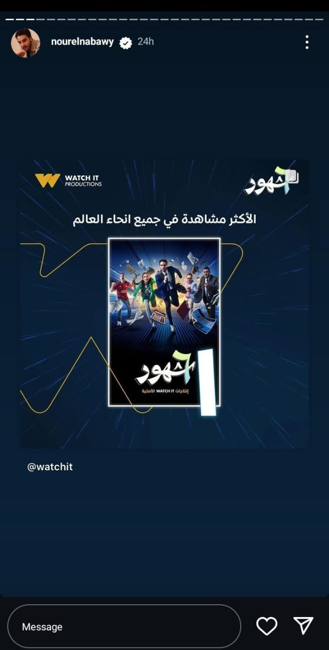 احتفل الفنان نور النبوي مع متابعية بتصدر مسلسل 6 شهور قائمة الأكثر مشاهدة عالميا علي المنصة الرقمية Watch it، وذلك من خلال استوري عبر موقع تبادل الصور والفديوهات القصيرة “إنستجرام”.
