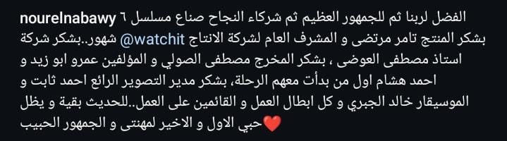 وفي سياق متصل، وجه الفنان نور النبوي رسالة شكر لصناع مسلسل 6 شهور، و لـ شركة Watch it وللجمهور من خلال حسابه الرسمي علي موقع تبادل الصور والفديوهات القصيرة “إنستجرام” معبرا عن إمتنانه لهم : “ الفضل لربنا ثم للجمهور العظيم ثم شركاء النجاح صناع مسلسل 6 شهور، بشكر المنتج تامر مرتضي والمشرف العام لشركة Watch it، بشكر شركة استاذ مصطفي العوضي، وبشكر المخرج مصطفي الصولي، والمؤلفين عمرو ابو زيدو أحمد هشام أول من بدأت معهم الرحلة، وبشكر مدير التصوير الرائع أحمد ثابت والموسيقار خالد الجبري وكل ابطال العمل والقائمين علي العمل، للحديث بقية ويظل حبي الأول والأخير لمهنتي وجمهوري الحبيب”.