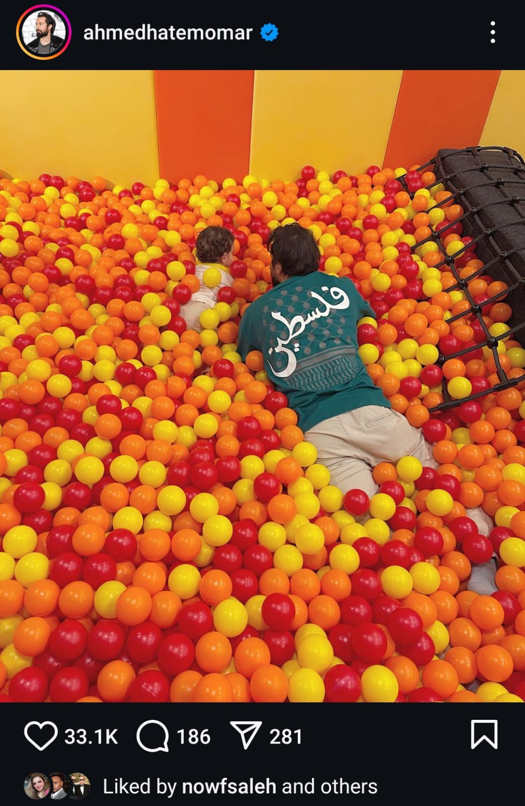 نشر أحمد حاتم صورة تجمعه مع نجله وهو مرتدي تيشيرت مكتوب عليه اسم فلسطين على صفحته الرسمية عبر موقع تبادل الصور والفيديوهات "إنستجرام".