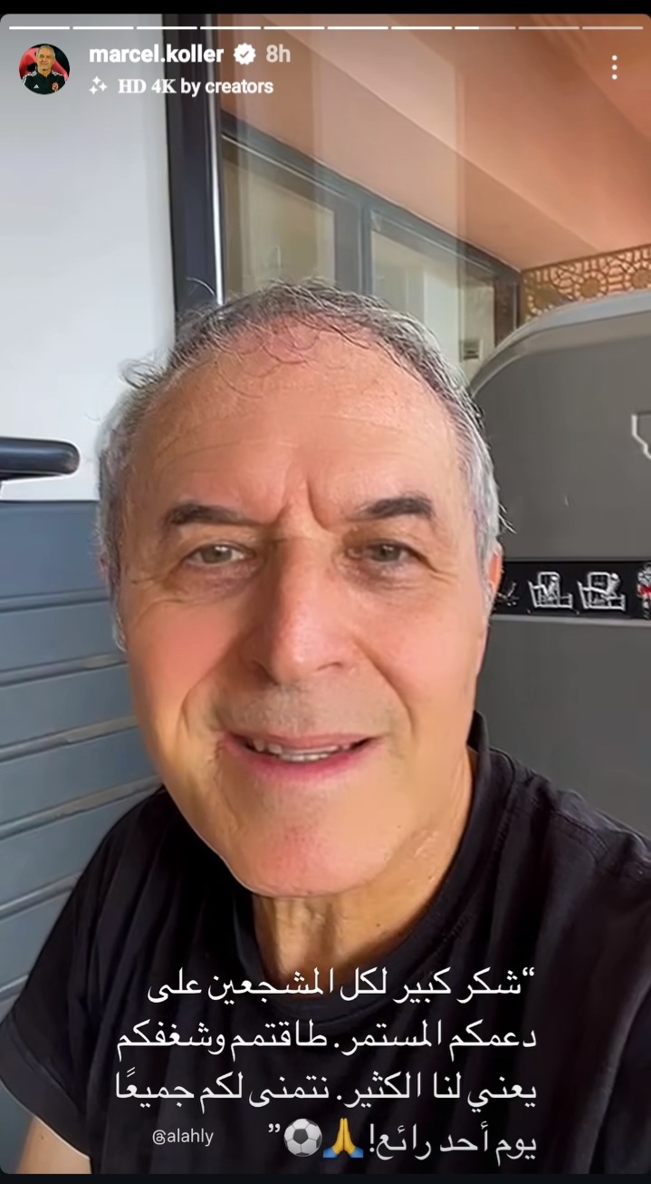 وجه السويسري مارسيل كولر المدير الفني لفريق الأهلي، رسالة إلى جماهير النادي الأهلي، بعد الفوز على سيراميكا كليوباترا، بالدوري المصري.
