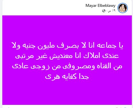 ونشرت ميار بوست عبر صفحتها الرسمية "فيس بوك" منفعلة قائلة " ياناس اقسم بالله ما قلت بصرف مليون جنيه المحامي بتداعي قالها مجازا وفي لحظة عصبية انا ربنا يعلم بحالى ارحمونى بقه".