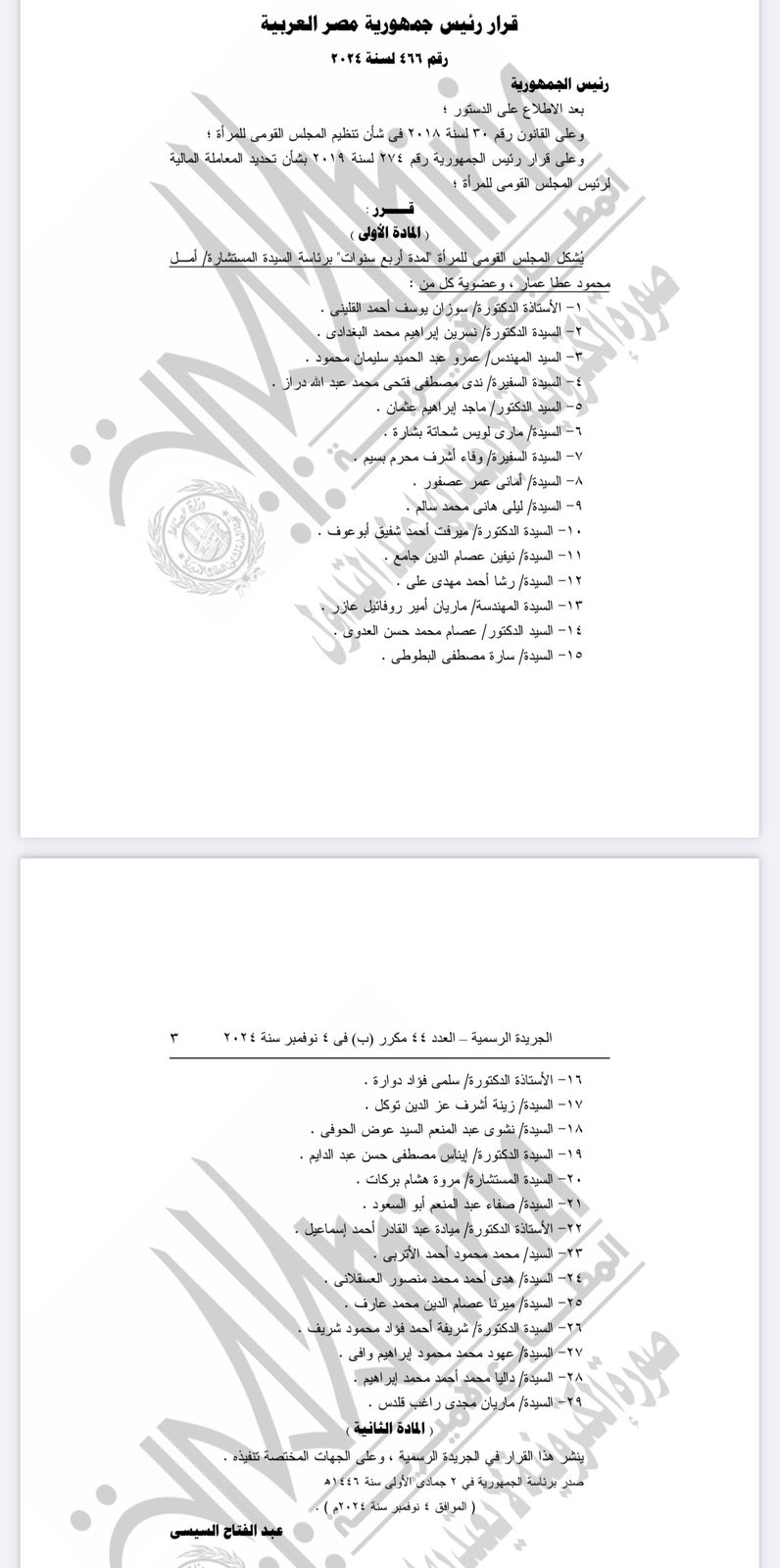 وكان قد أصدر الرئيس عبد الفتاح السيسي، القرار رقم 466 لسنة 2024، بتشكيل المجلس القومي للمرأة لمدة 4 سنوات، برئاسة المستشارة أمل محمود عطا عمار، رئيسية المجلس القومي للمرأة وأعضائه الـ 29 سيد/ة.
