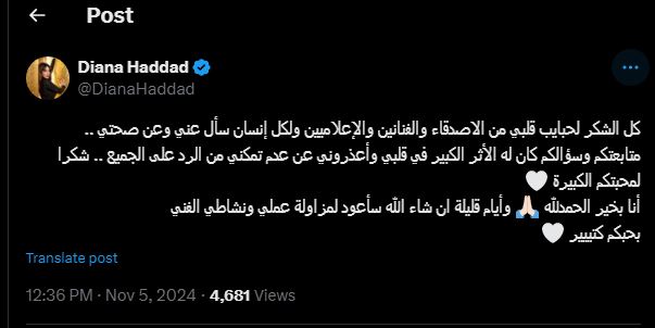 وجهت النجمة ديانا حداد الشكر لكل من أصدقائها والإعلاميين لجمهورها ، عبر حسابها الرسمي بموقع "إكس" لكل من ساندها وسأل عنها في أزمتها الصحية .