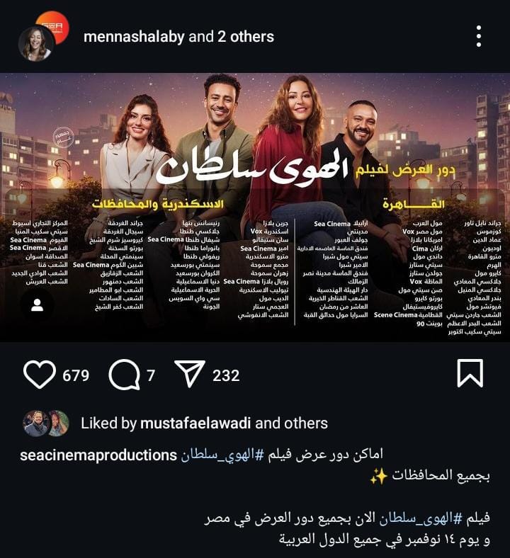 أعلنت الفنانة منه شلبي عن موعد عرض فيلم الهوى سلطان في السينمات وأماكن دور العرض في جميع السينمات في مصر.