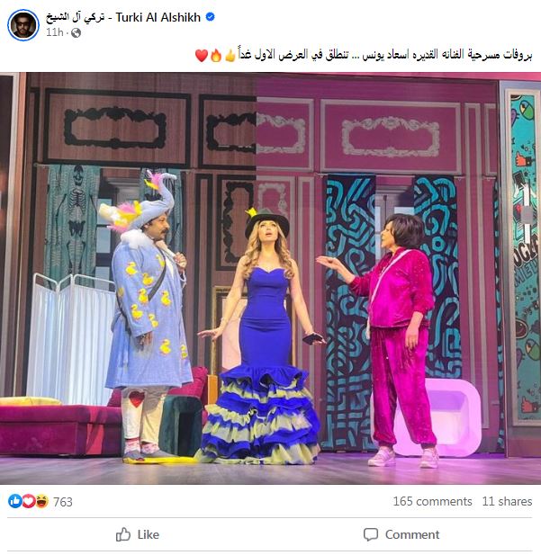 ونشر المستشار تركي آل الشيخ رئيس الهيئة العامة للترفيه بالمملكة العربية السعودية، صورة من كواليس المسرحية عبر صفحته بموقع التواصل الاجتماعي فيسبوك: وكتب: “بروفات مسرحية الفنانة القديرة إسعاد يونس تنطلق في العرض الأول غدًا”.