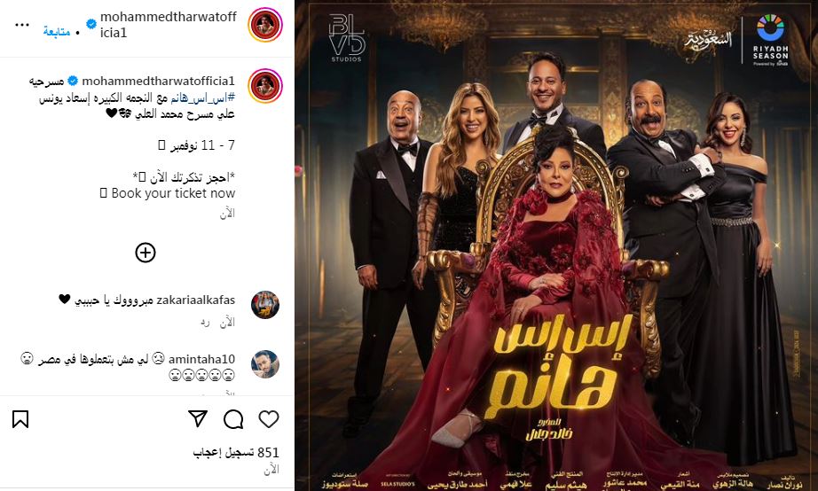 كما روج الفنان محمد ثروت، لمسرحية إس إس هانم ونشر بوستر المسرحية، عبر حسابه على إنستجرام، وعلق: "مسرحية إس إس هانم مع النجمة الكبيرة إسعاد يونس على مسرح محمد العلي.. 7 - 11 نوفمبر".