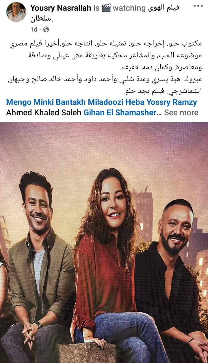وأضاف: "مبروك هبة يسري ومنة شلبي وأحمد داود وأحمد خالد صالح وجيهان الشماشرجي، فيلم بجد حلو".
