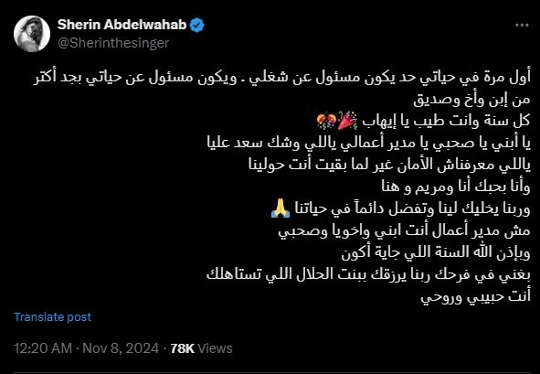 قدمت الفنانة شيرين عبدالوهاب رسالة مليئة بالمشاعر لمدير أعمالها في يوم ميلاده، معبرة عن مدى تقديرها له بقولها إنها تراه كابنٍ أو أخٍ لها وأولادها يحبوه بشكل كبير.