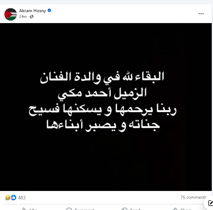 وكتب أكرم حسني منشورا على صفحته الرسمية عبر موقع التواصل الاجتماعي "فيسبوك" وعلق قائلا : "البقاء لله في والدة الزميل أحمد مكي، ربنا يرحمها ويسكنها فسيح جناته ويصبر أبناءها" .