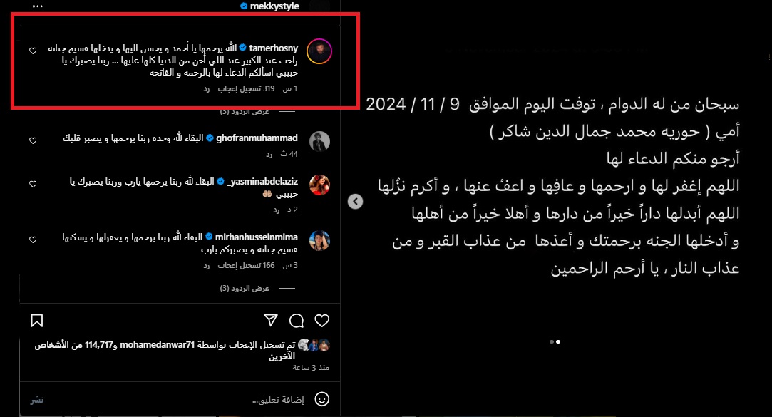 علق تامر حسني على منشور أحمد مكي الذي أعلن فيه وفاة والدته بكلمات مواساة، قائلاً: "الله يرحمها يا أحمد ويجعل مثواها الجنة، راحت عند ربنا، اللي أحنّ عليها من الدنيا كلها."